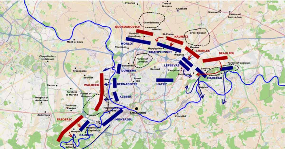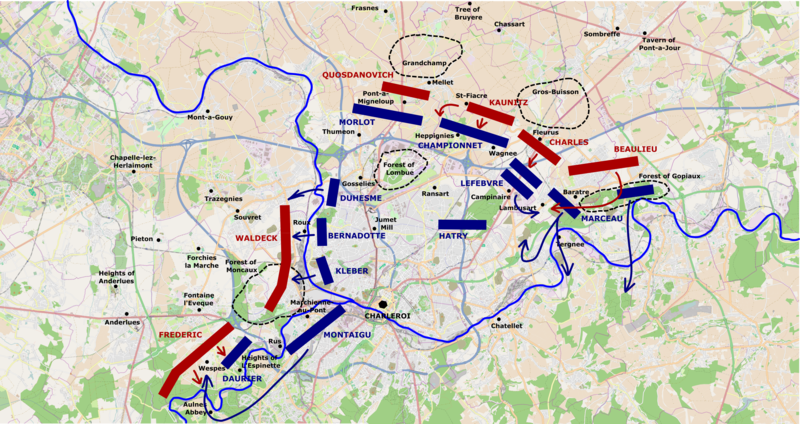 A map depicting the maneuvers in the Battle of Fleurus (26 June 1794) from around 10 a.m. to 1 p.m. Map by Talamioros, with OpenStreetMap, December 2021.