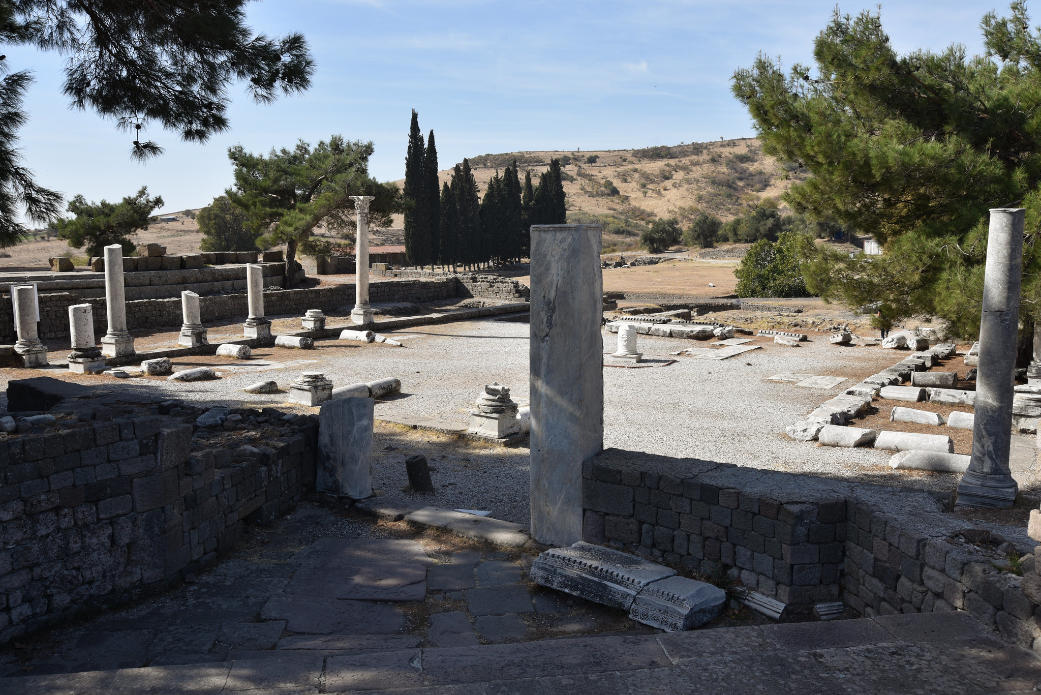 View of the entrance courtyard of the Asklepieion of Pergamon sacred area. It was a large courtyard of 120 x 90 m surrounded by galleries with columns (stoa) on three sides.