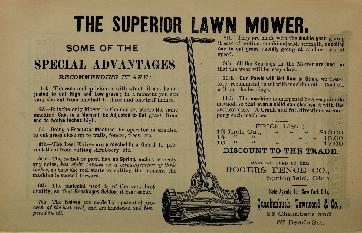 A 19th-century advertisement for a lawnmower. The lawnmower was invented by Edwin Budding in England in 1830. The machine replaced the much slower and more expensive process of cutting grass by hand using a scythe. Budding was inspired by the rotary blades used in the textile industry. The machine was popular with gardeners and those who managed sports fields, making a cut lawn an affordable reality for many more people. The machine has evolved but Budding's essential design is still used today in many models.