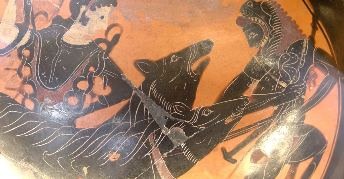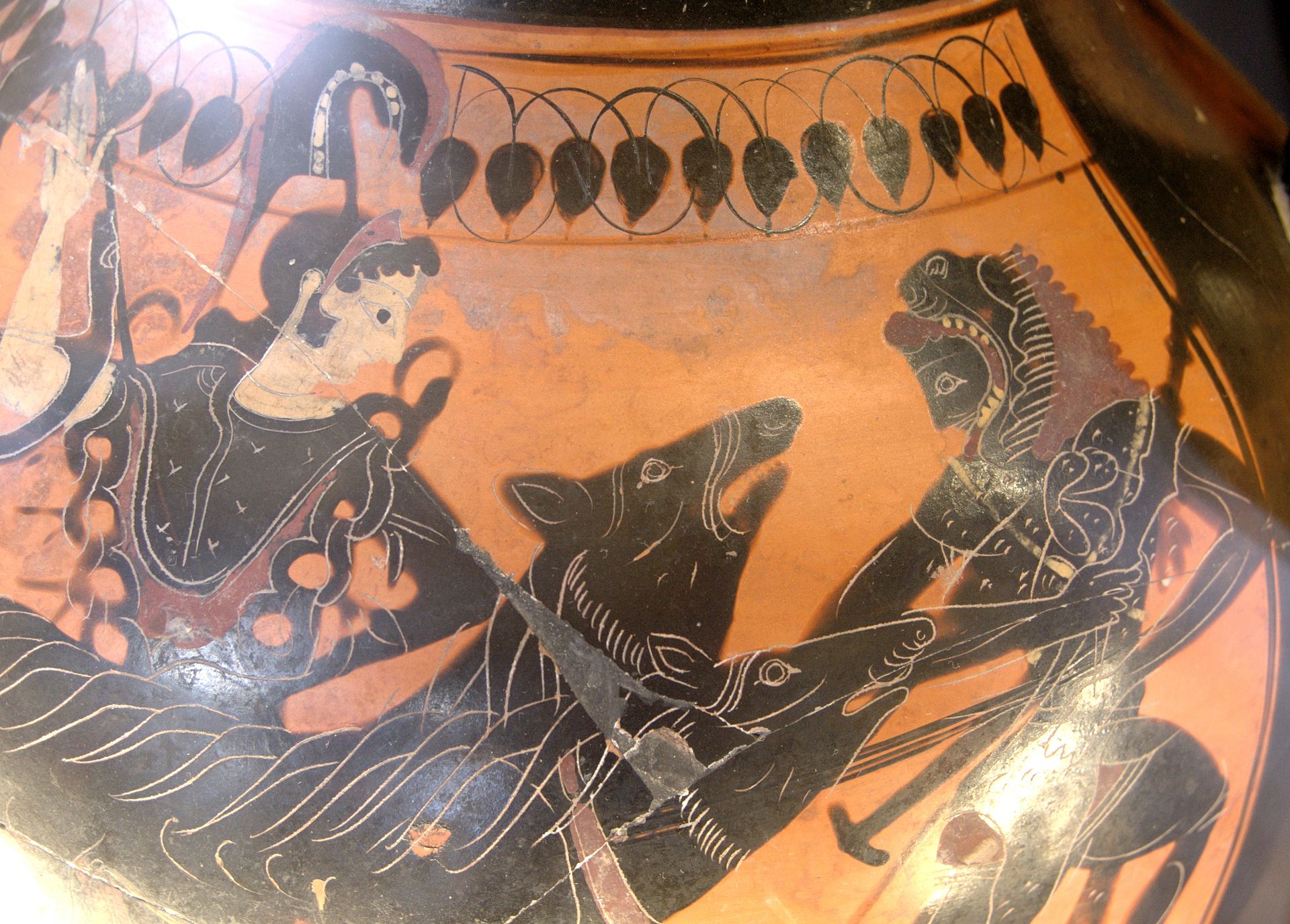 Athena, Hercules, and a two-headed Cerberus, with a mane down his necks and back. Hermes (not shown in the photograph) stands to the left of Athena. Attic black-figure amphora from Kameiros (Rhodes), c. 510 BCE.