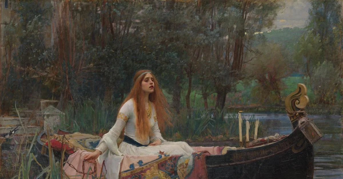 The poem speaks of a cursed woman who lives in a tower on an island named Shalott, downriver from Camelot, the castle of King Arthur. She only sees the world through the reflection in a mirror and one day she sees the reflection of Sir Lancelot and she cannot resist the temptation to look at him directly. The mirror cracks and she is cursed to drift down the river alone, singing a song but dying before she reaches the shore.