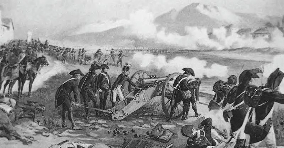 At the Battle of Lodi, 24 French cannons were placed along the west bank of the Adda River to bombard the Austrian positions across the river. Image by Felicien de Myrbach-Rheinfeld, in Life of Napoleon Bonaparte by William M. Sloane. New York: Century, vol. 1; 1906.