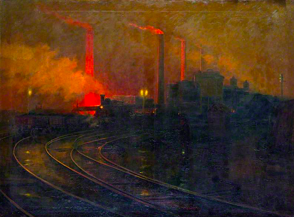 A c. 1896 oil on canvas painting, Steelworks, Cardiff, at Night, by Lionel Walden (1862-1933). (Amgueddfa Cymru – Museum Wales)