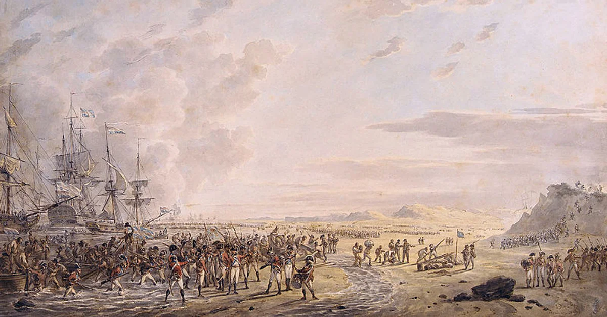 Landing of English troops in Holland on 27 August 1799 to partake in the ill-fated Anglo-Russian invasion of Holland during the War of the Second Coalition (1798-1802). Watercolor painting by Dirk Langendijk, 1799.