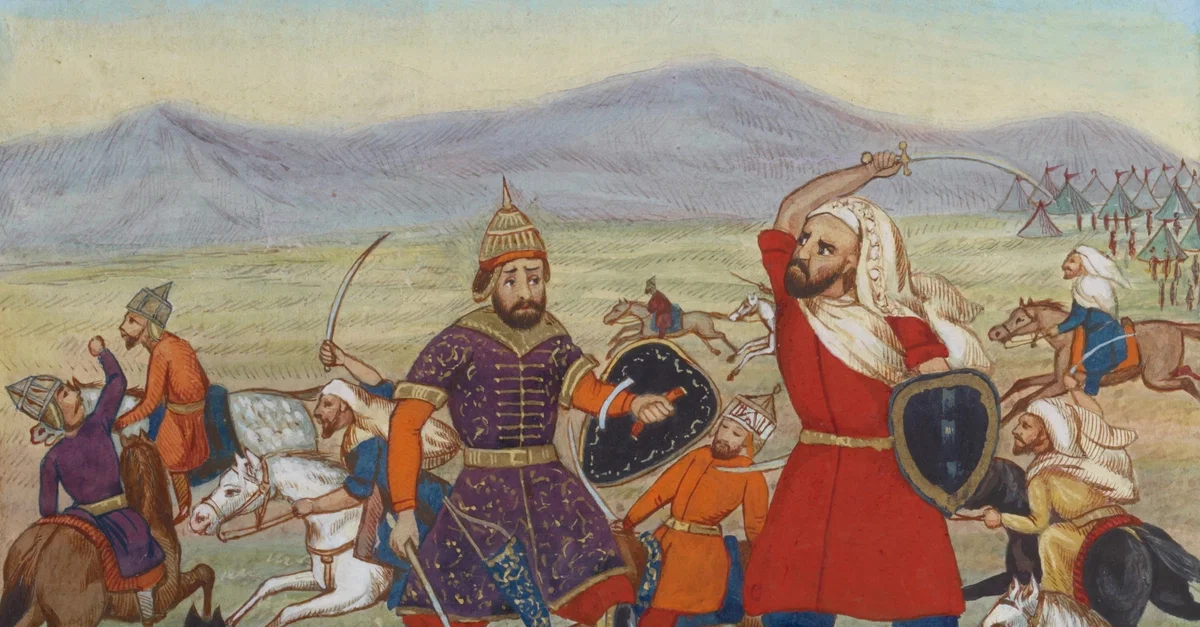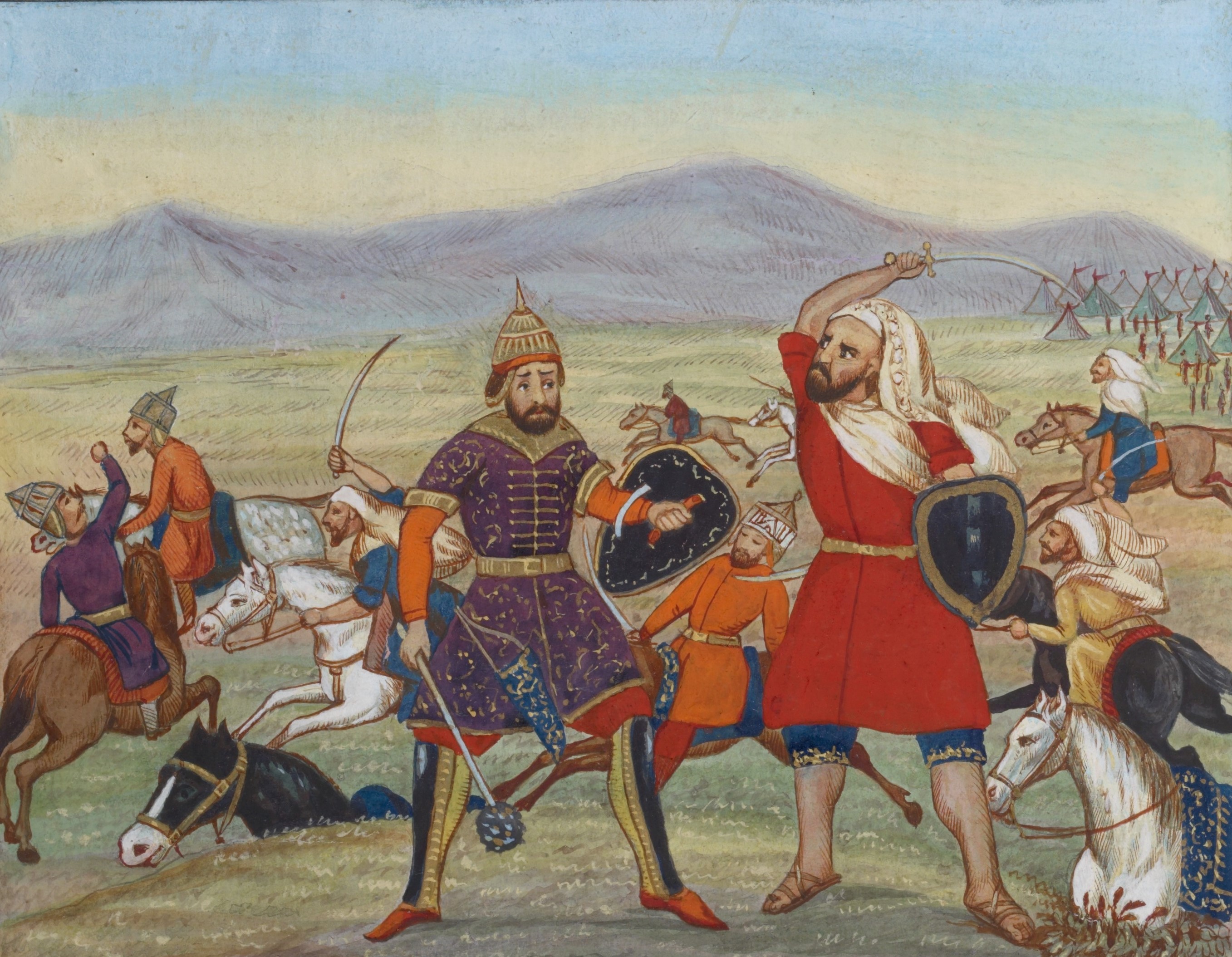 Rostam, Yazdegerd III's general, slain by Sa'd, the son of Vaqqâs the Arab, illustration from the Tarjumah-i Shâhnâmah (Translation of Shahnameh into Turkish, Spencer Coll. Turk. MS. 1), 1616-1620.