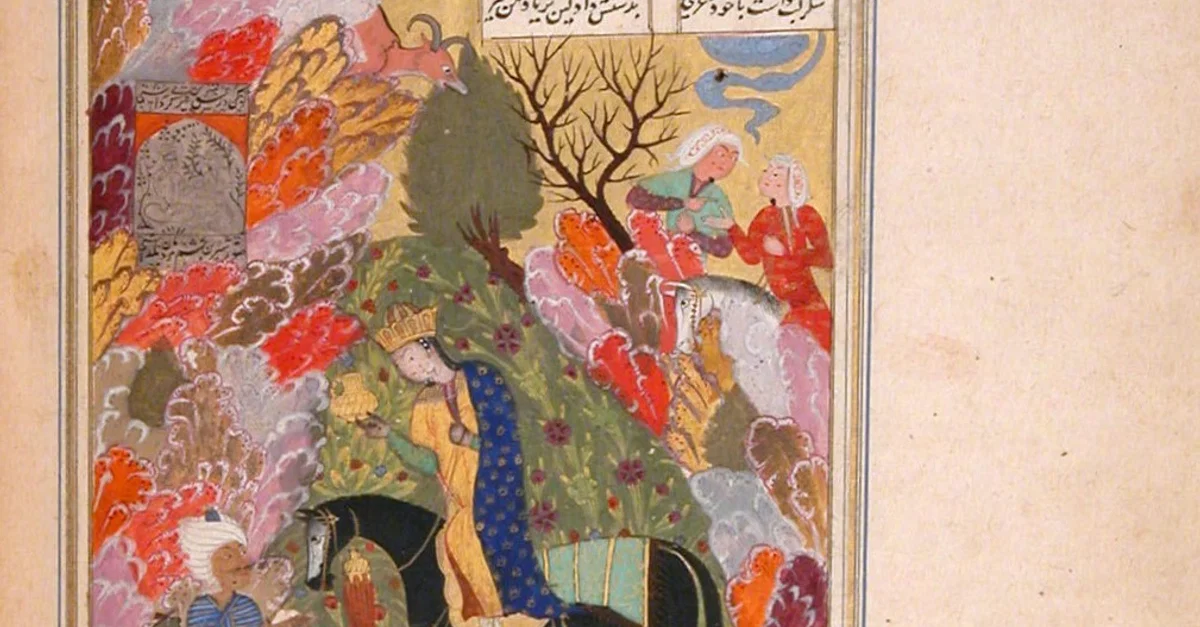 Shirin goes to see the wonderful rock-carvings by the sculptor Farhad, her admirer. Illustration from the Khamsa (Quintet) of Nizami of Ganja, Shiraz, Iran, 1509-10.
