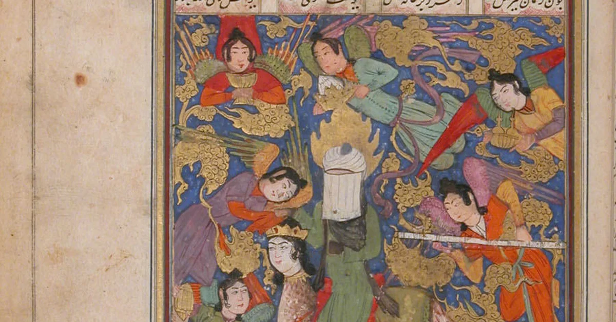 Muhammad's ascent to heaven in a vision, illustration from the Khamsa (Quintet) of Nizami of Ganja, Shiraz, Iran, 1449-50 CE.