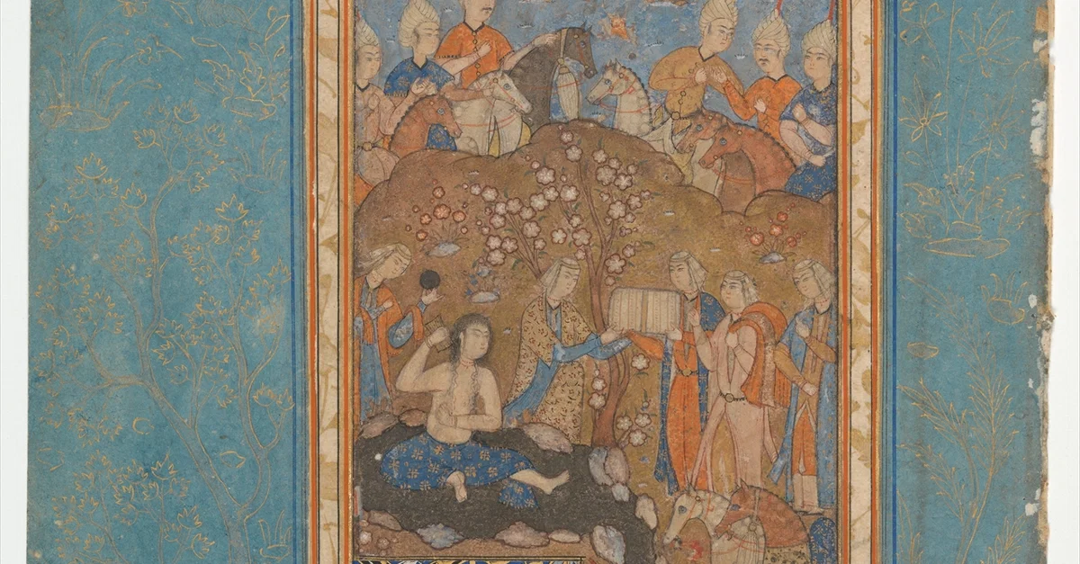 Khosrow II spies Shirin Bathing, illustration from the Khamsa (Quintet) of Nizami of Ganja, Shiraz, Iran, 16th century CE.