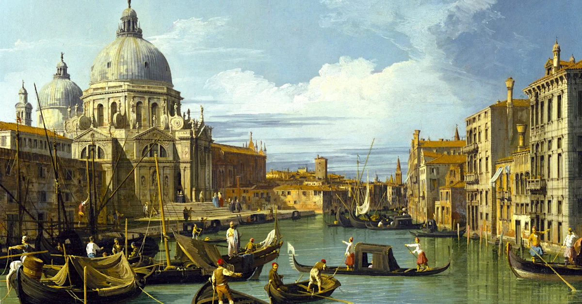 A c. 1730 oil on canvas painting, Entrance to the Grand Canal, Venice, by the Italian artist Canaletto (1697-1768). (Museum of Fine Arts, Houston)