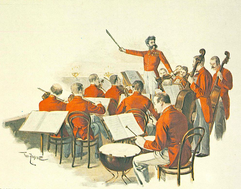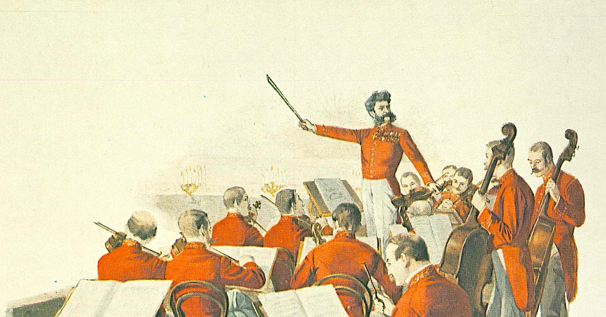 An 1888 colour print by Theo Zasche of the Austrian composer Johann Strauss II (1825-99) conducting the court orchestra in Vienna.