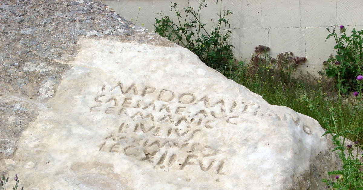 Latin text : "Imp(eratore) Domitiano / Caesare Aug(usto) / Germanic(o) / L(ucius) Iulius / Maximus (centurio) / leg(ionis) XII Ful(minatae)".