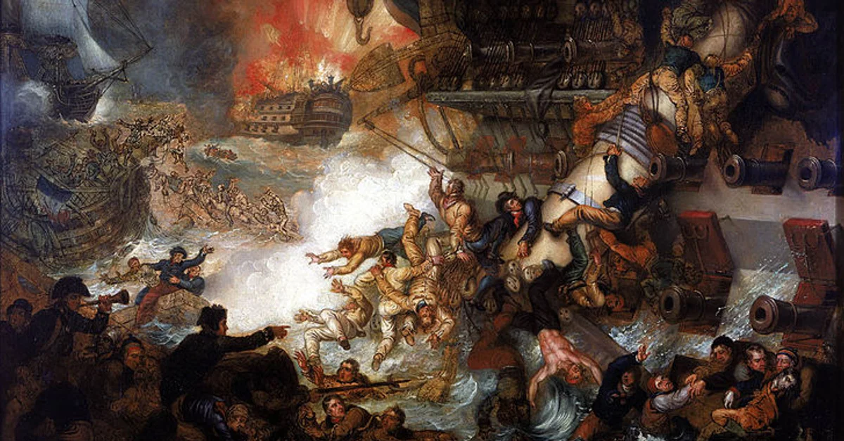 A depiction of the moment that the powerful French warship, L'Orient, exploded during the Battle of the Nile (1-2 August 1798). Oil on canvas by Mather Brown, 1825.