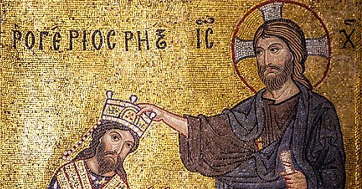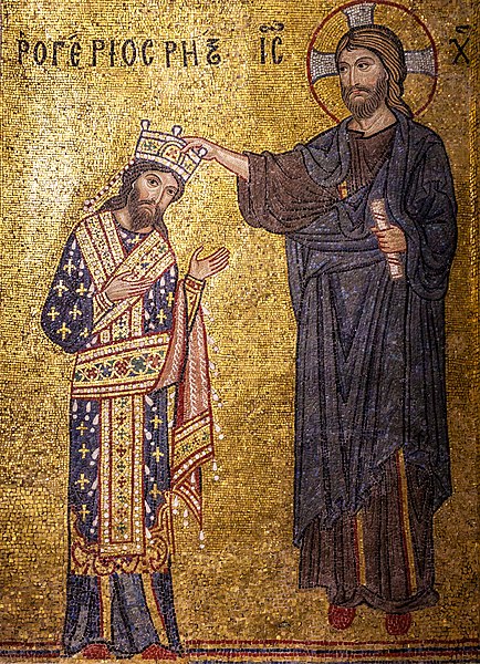 Coronation of Roger II, King of Sicily (r. 1130-1154), mosaic in La Martorana, also known as Santa Maria dell'Ammiraglio (Saint Mary of the Admiral), in Palermo, Sicily, Italy.