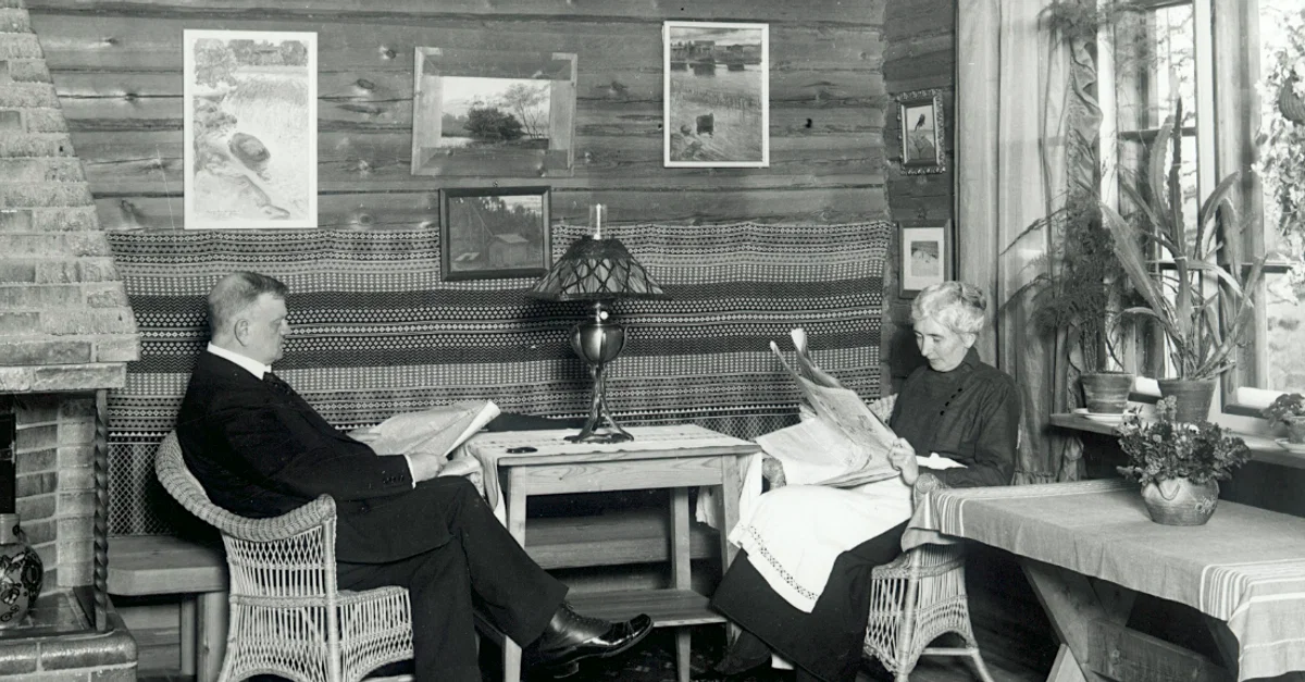 A 1915 photograph taken by Eric Sundström of the Finnish composer Jean Sibelius (1865-1957) and his wife reading at their home Ainola, north of Helsinki. (Helsinki City Museum)