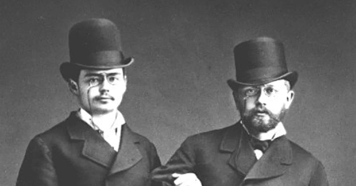 An 1877 photograph of the Russian violinist Iosif Kotek and the Russian composer Pyotr Ilyich Tchaikovsky (1840-1893).