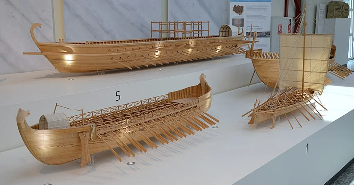 1:10 model reconstructions of Roman ships. 5: Dromon of the Byzantine navy (10-12th centuries CE), left: Bireme of the Neumagen type (220-230 CE)
