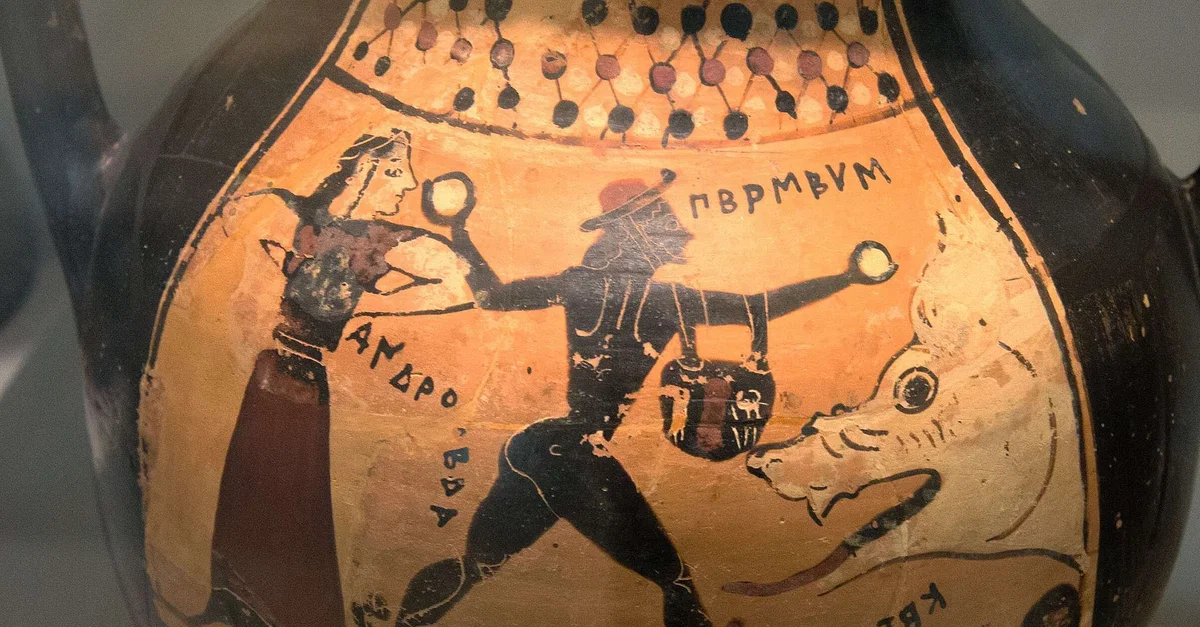 Perseus defends Andromeda from the monster Cetus by pelting it with stones. Corinthian black-figure amphora from Cerveteri (Italy), 575-550 BCE.