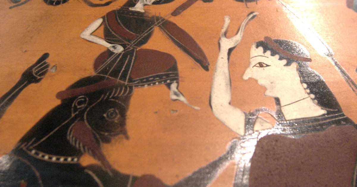 The birth of Athena from the head of Zeus and with Eileithyia looking on. Black-figure amphora, made in Athens, c. 550-525 BCE.