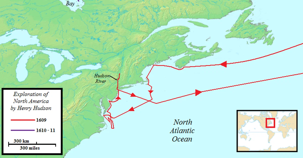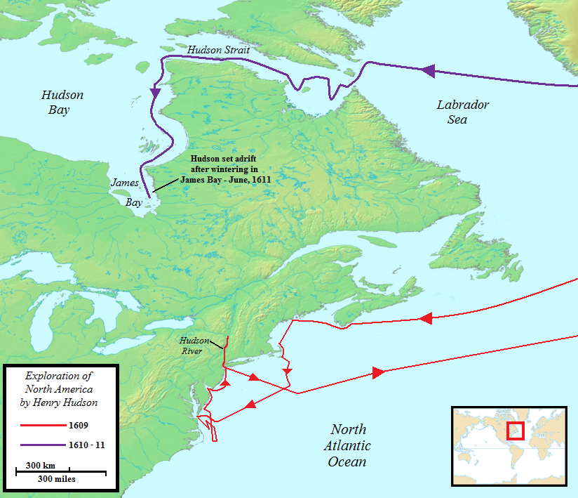 Map of the two North American voyages of Henry Hudson (c. 1570-1611). The route of the first voyage is shown in red, the second in purple.