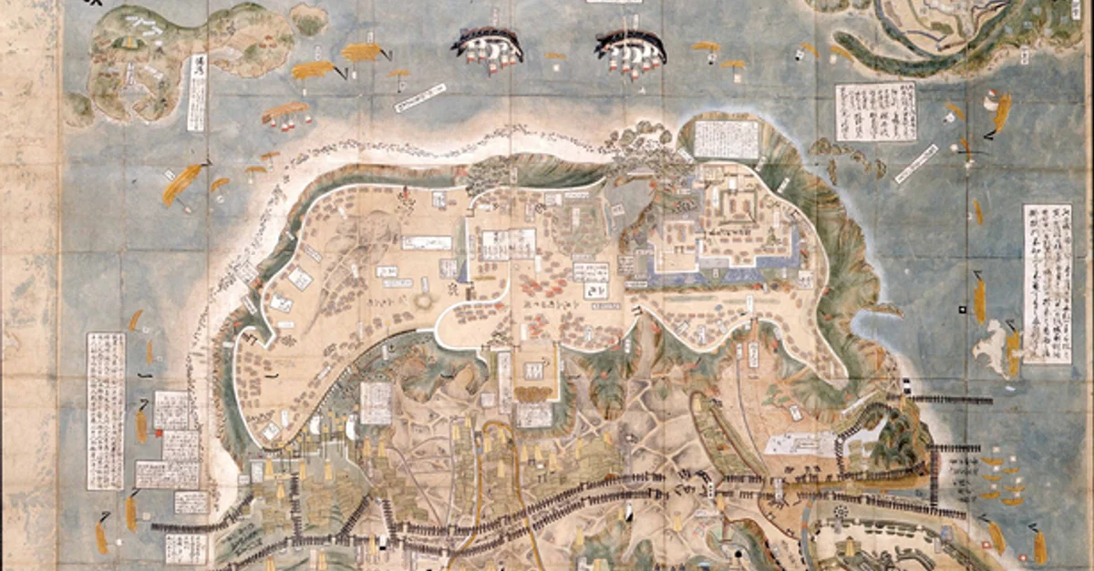 Map of the Siege of Hara Castle during the Shimabara Rebellion, c. 17th century. Note the Dutch ships at the top, who would have fired cannonades upon the defenders.