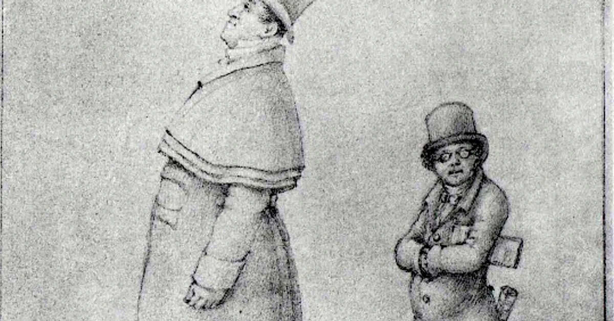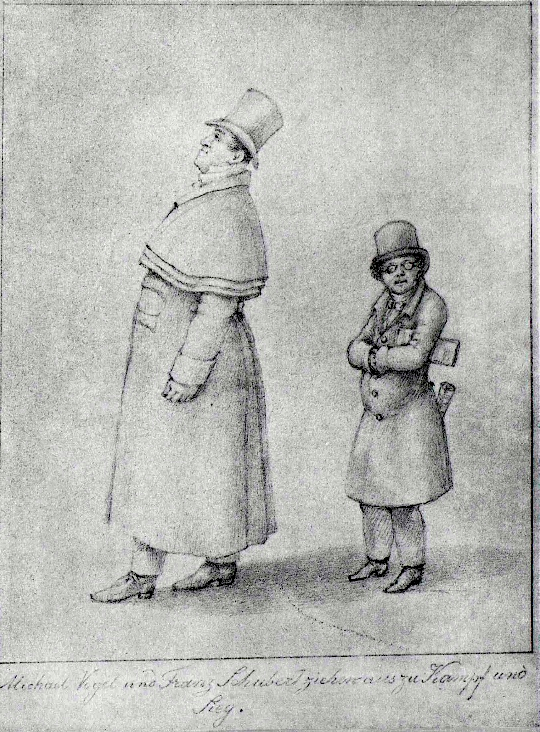 A c. 1825 caricature of the Austrian composer Franz Schubert (1797-1828) on the right and the baritone singer Johann Michael Vogl (1768-1840) who sang many of the composer's songs. Drawing attributed to Franz Schober. (National Library of Austria)