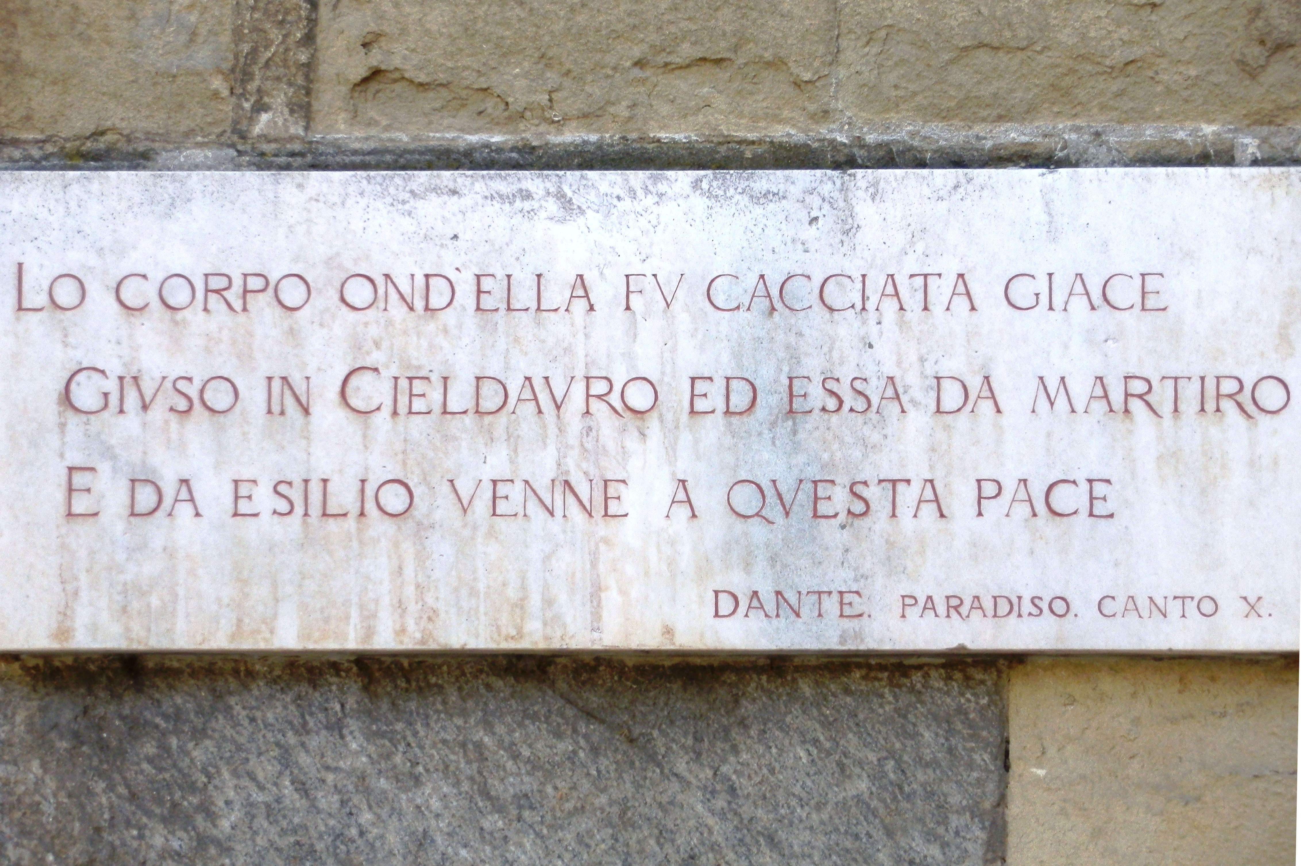 Inscription in the façade of Saint Peter in Golden Sky (Pavia), the church (crypt) where Boethius' mortal remains rest. The writing quotes the verses dedicated to him in the tenth canto of Dante's Paradise: "The body whence it was chased forth / lieth down below in Cieldauro and itself from martyrdom / and exile came unto this peace." (Transl. by P.H. Wicksteed and H. Oelsner - London 1908)
