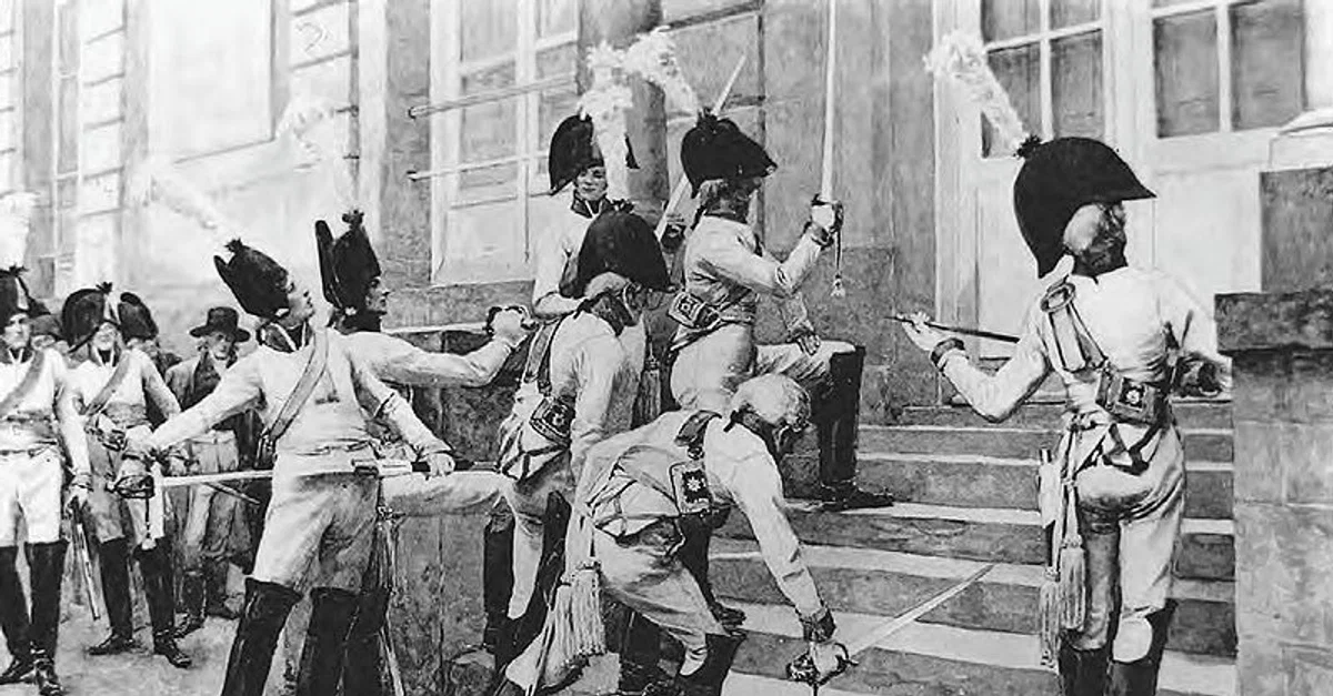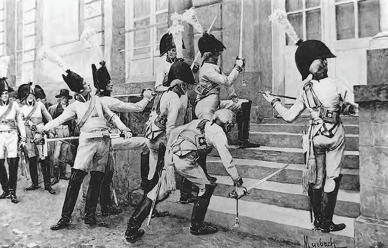 Hoping to provoke war with France, Prussian officers of the elite Life Guards Regiment sharpen their swords on the steps of the French embassy in Berlin in the summer of 1806. Drawing by Felician Myrbach, 1906.