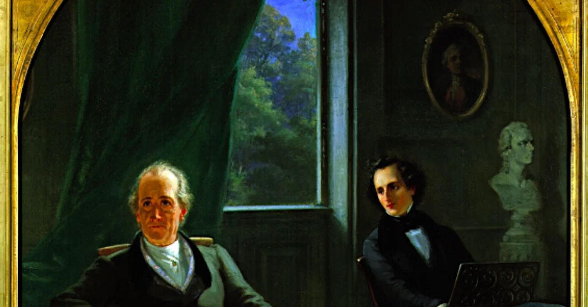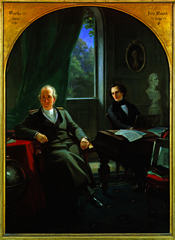 An 1864 painting by Moritz Oppenheim showing the composer Felix Mendelssohn (1809-1847) playing to poet Johann Wolfgang von Goethe (1749-1832). (Jewish Museum Frankfurt am Main)