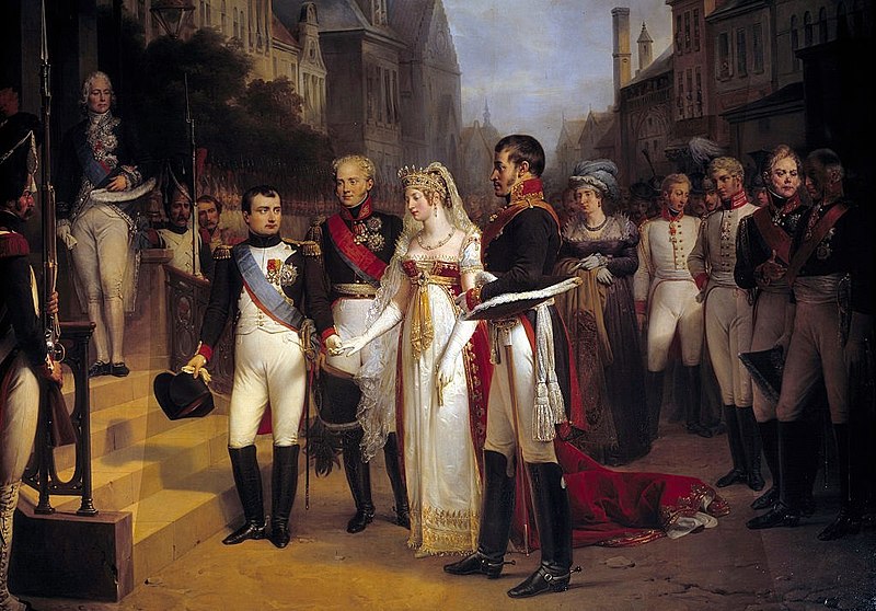 A meeting of the monarchs of France, Russia, and Prussia during the signing of the Treaties of Tilsit. Depicted in the center of the painting, from left to right: French Emperor Napoleon I, Tsar Alexander I of Russia, Queen Louise of Prussia, and King Frederick William III of Prussia. French foreign minister Charles-Maurice de Talleyrand is shown in the background on the left side, standing mischievously on a staircase.