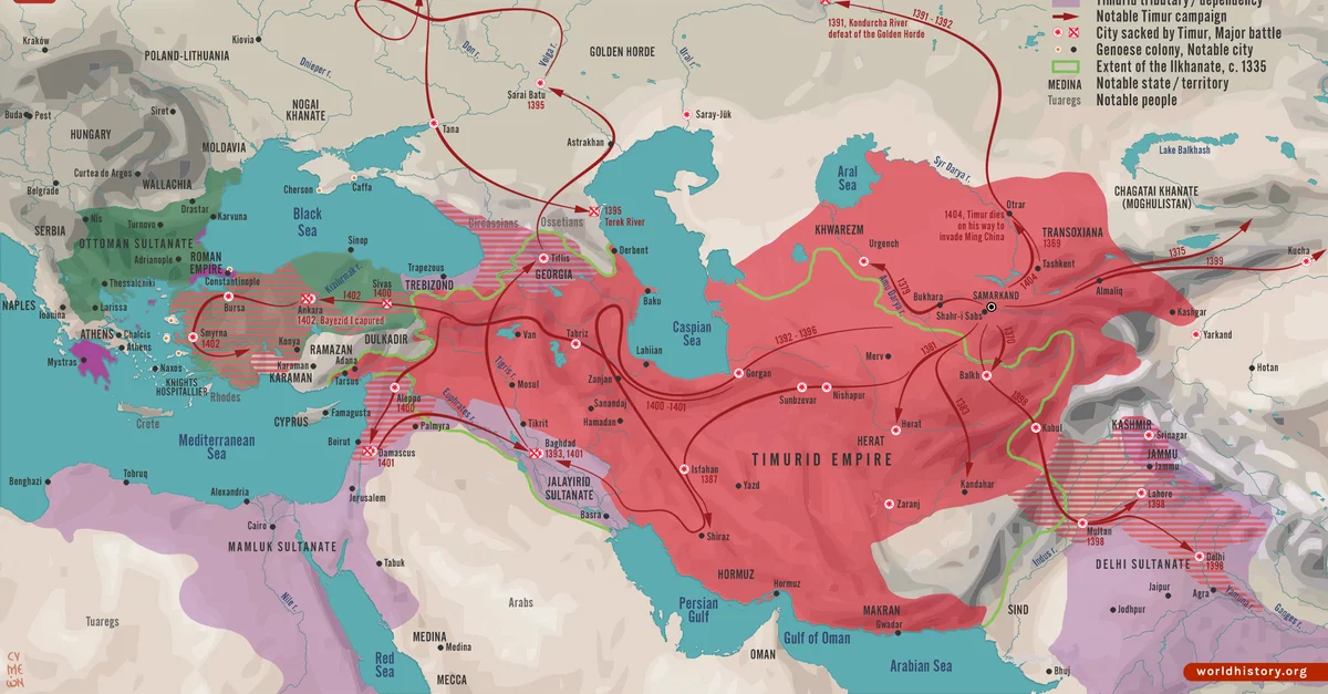 Netchev, S. (2023, August 07). Map of the Empire of Timur the Lame, c. 1404 CE. World History Encyclopedia. https://www.worldhistory.org/image/17689/map-of-the-empire-of-timur-the-lame-c-1404-ce/