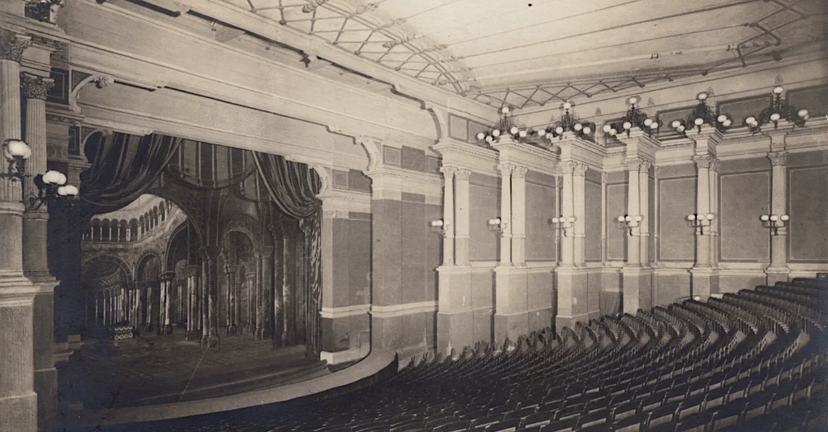 A c. 1910 postcard showing the interior of the Festspielhaus in Bayreuth, Germany. It was completed in 1876. It was designed with input from the composer Richard Wagner (1813-1883) to ensure good acoustics, a clear audience view of the stage, and to have the orchestra hidden from view.