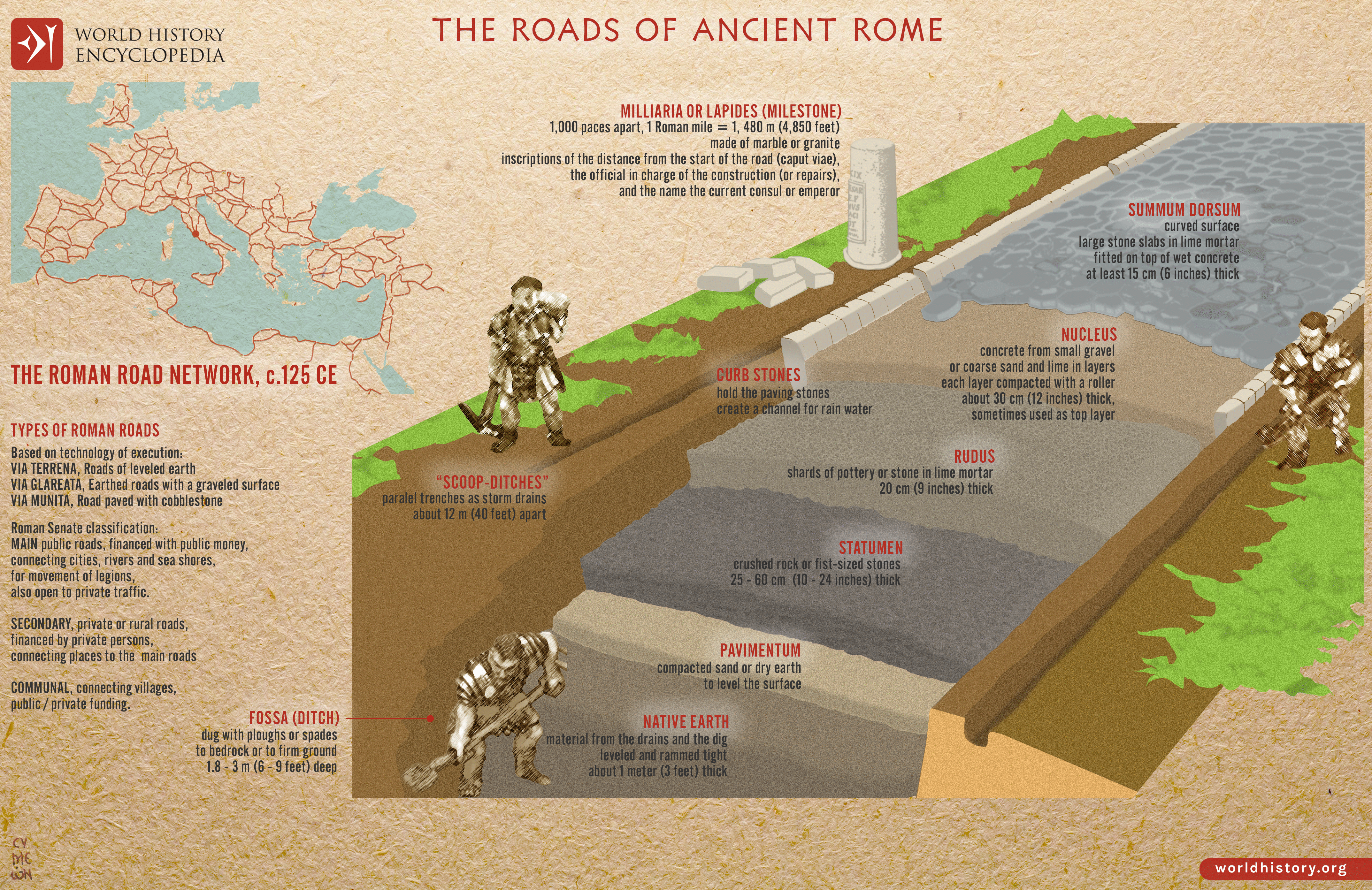 This infographic illustrates the typical structure of Roman roads, one of the most enduring engineering achievements of the ancient world. While the Romans are credited with revolutionizing road construction, they likely adopted many foundational techniques from the Etruscans and refined them over time. As the empire expanded, Roman engineers incorporated methods and materials from local cultures, adapting their designs to different terrains while maintaining a standardized core structure.