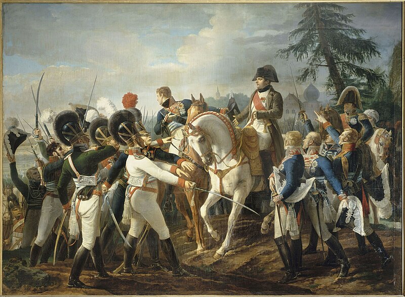 Emperor Napoleon I reviews Bavarian and Württemberger troops during the Battle of Abensberg, part of the War of the Fifth Coalition (1809). Painting by Jean-Baptiste Debret, 1810.
