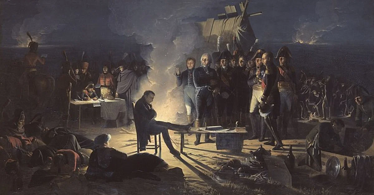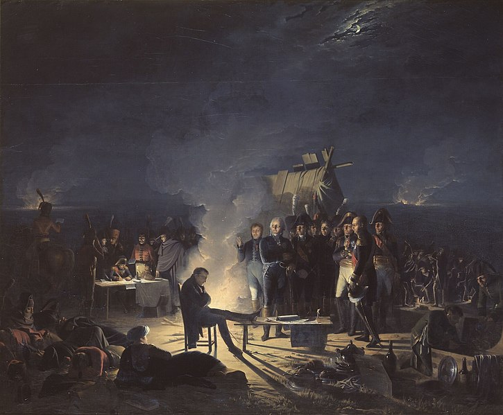 Napoleon confers with his officers well into the night after the first day of the Battle of Wagram (5-6 July 1809), oil on canvas by Adolphe Roehn, 1810.