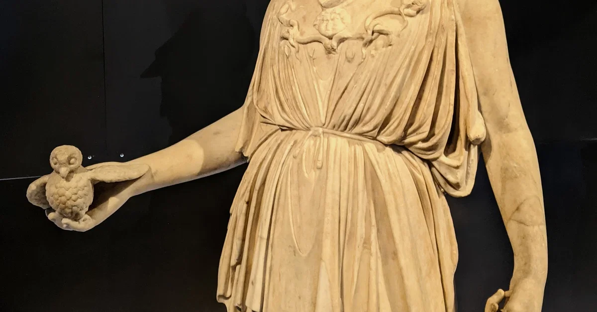 In this particular depiction of Athena, she is portrayed wearing a helmet and a heavy robe. Her contemplative pose represents her role as a martial deity who values intellect and strategy over brute force. The breastplate she wears is adorned with the head of Medusa, symbolizing Athena's ability to conquer evil. Originally, this statue would have held a spear and possibly a figure of Nike, the goddess of victory, but it was later replaced with an owl.