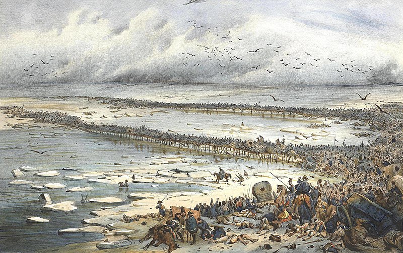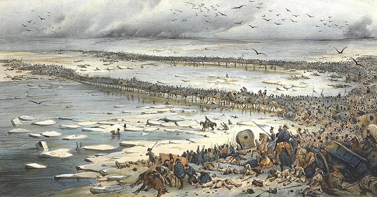 Napoleon's Grande Armée retreats across the freezing Berezina River at the end of the catastrophic invasion of Russia of 1812. Painting by Victor Adam, c. 19th century.