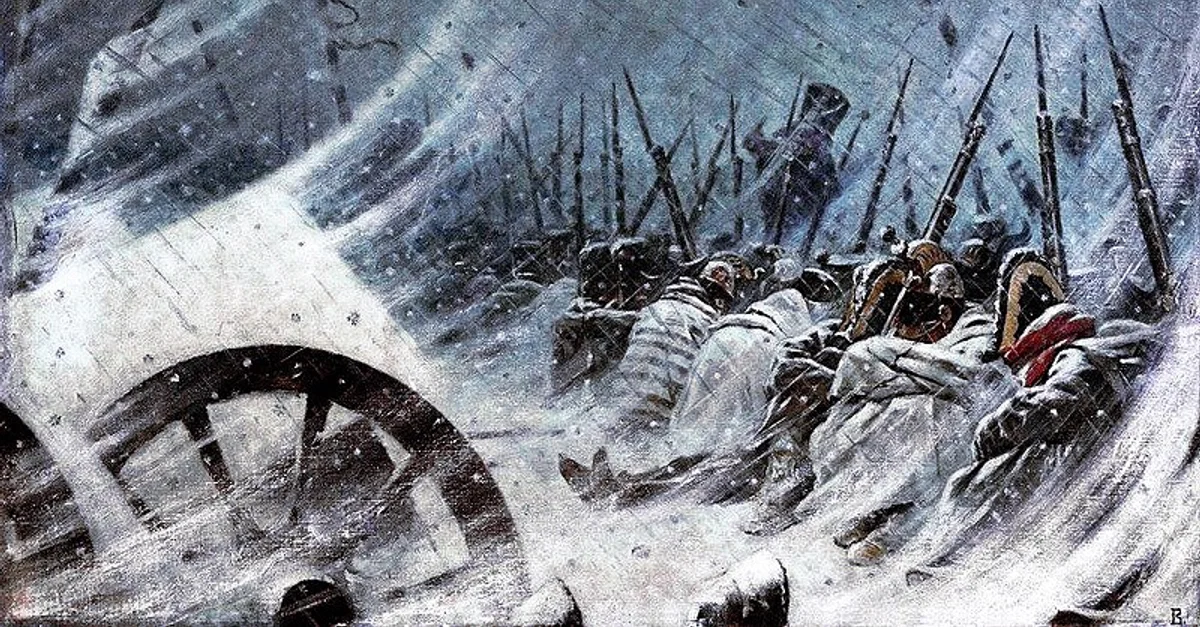 Napoleon's Grande Armée bivouacs during a nighttime blizzard during their retreat from Moscow, 1812. Painting by Vasily Vereshchagin, part of the series Napoleon I in Russia, c. 1896-97,