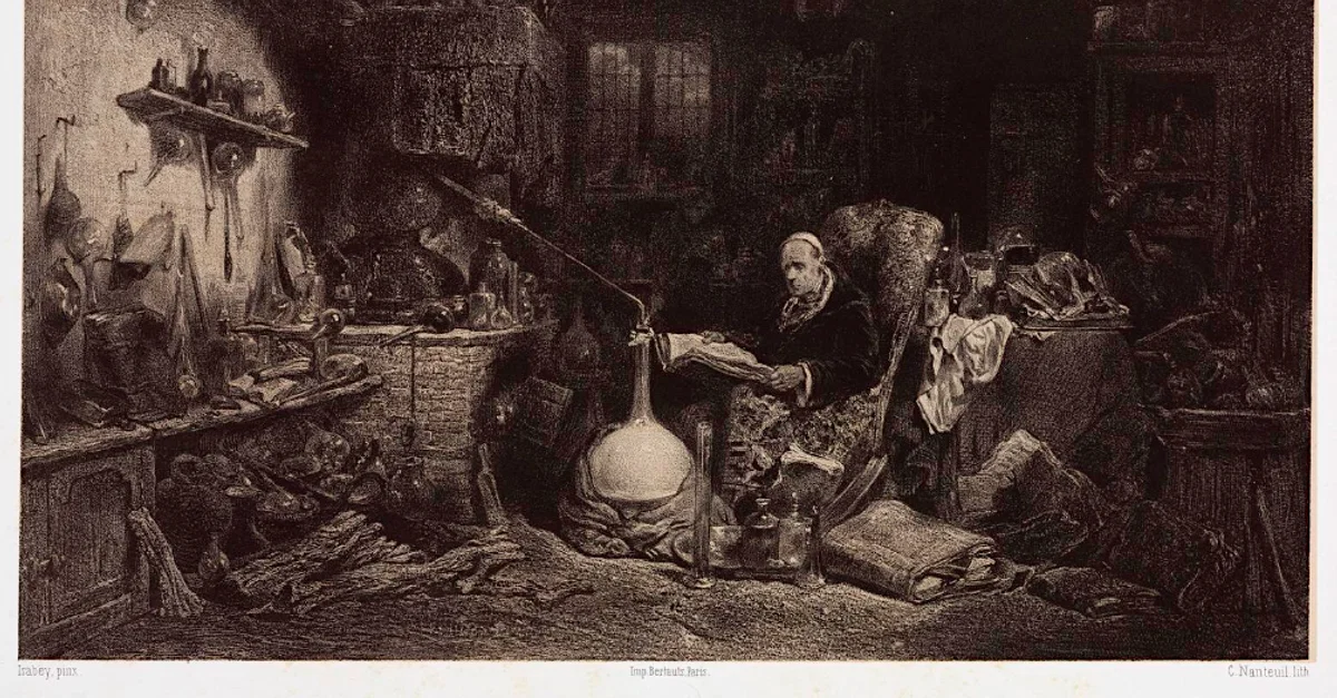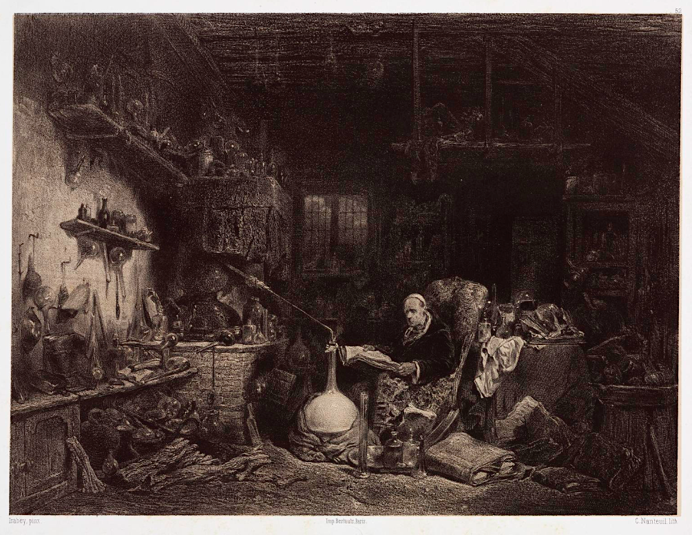 A c. 1850 lithographic print, The Alchemist, by Celestin Nanteuil. The figure is in possession of the typical apparatus of alchemy such as a condenser and furnace. (Science Museum, London)
