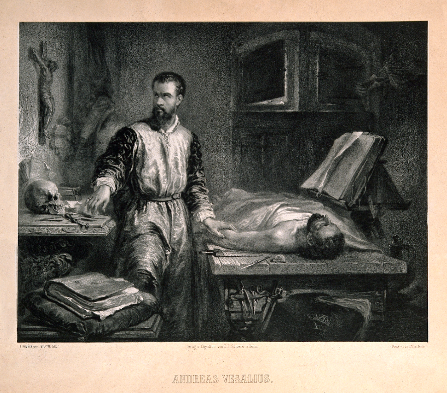 A lithographic print showing the famed anatomist Andreas Vesalius (1514-64) about to dissect a human body. Lithograph by E. Milster after E. J. C. Hamman, 1849. (Wellcome Images)