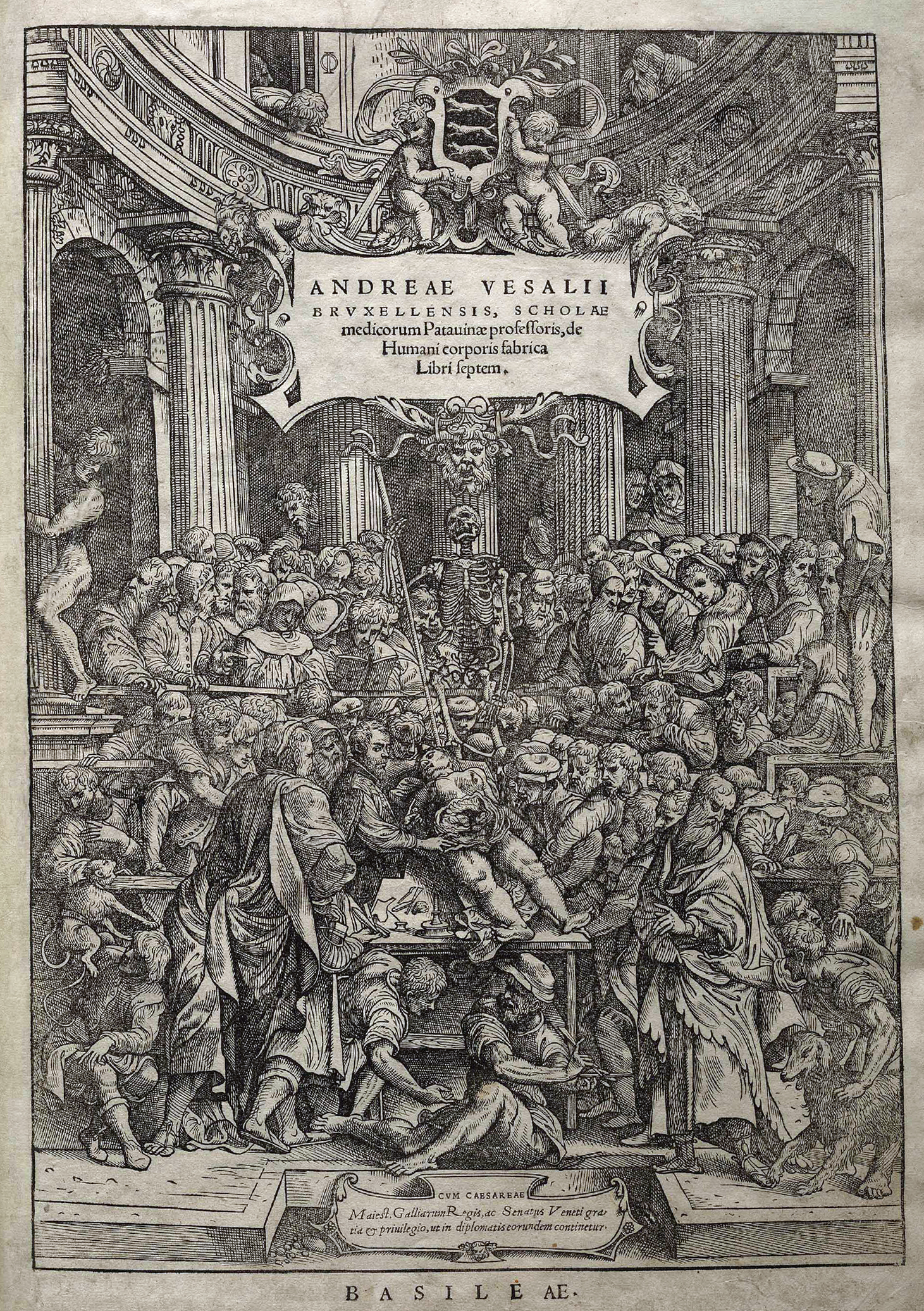 The frontispiece of On the Fabric of the Human Body (1543) by Andreas Vesalius (1514-64). The anatomist is shown making a dissection of a human body. (National Library of Medicine)