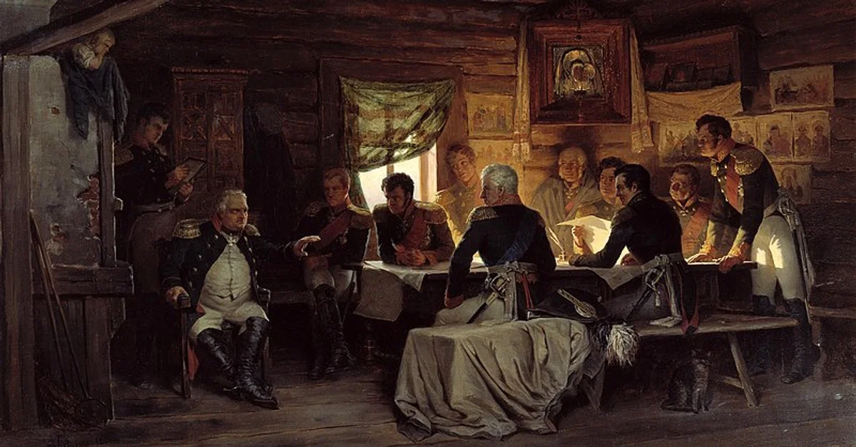 After the Battle of Borodino, Russian Field Marshal Mikhail Kutuzov meets with his staff at Fili village on 13 September 1812. After a heated argument, Kutuzov decides to abandon Moscow in order to continue the war of attrition. Oil on canvas by Aleksey Kivshenko, 1880.