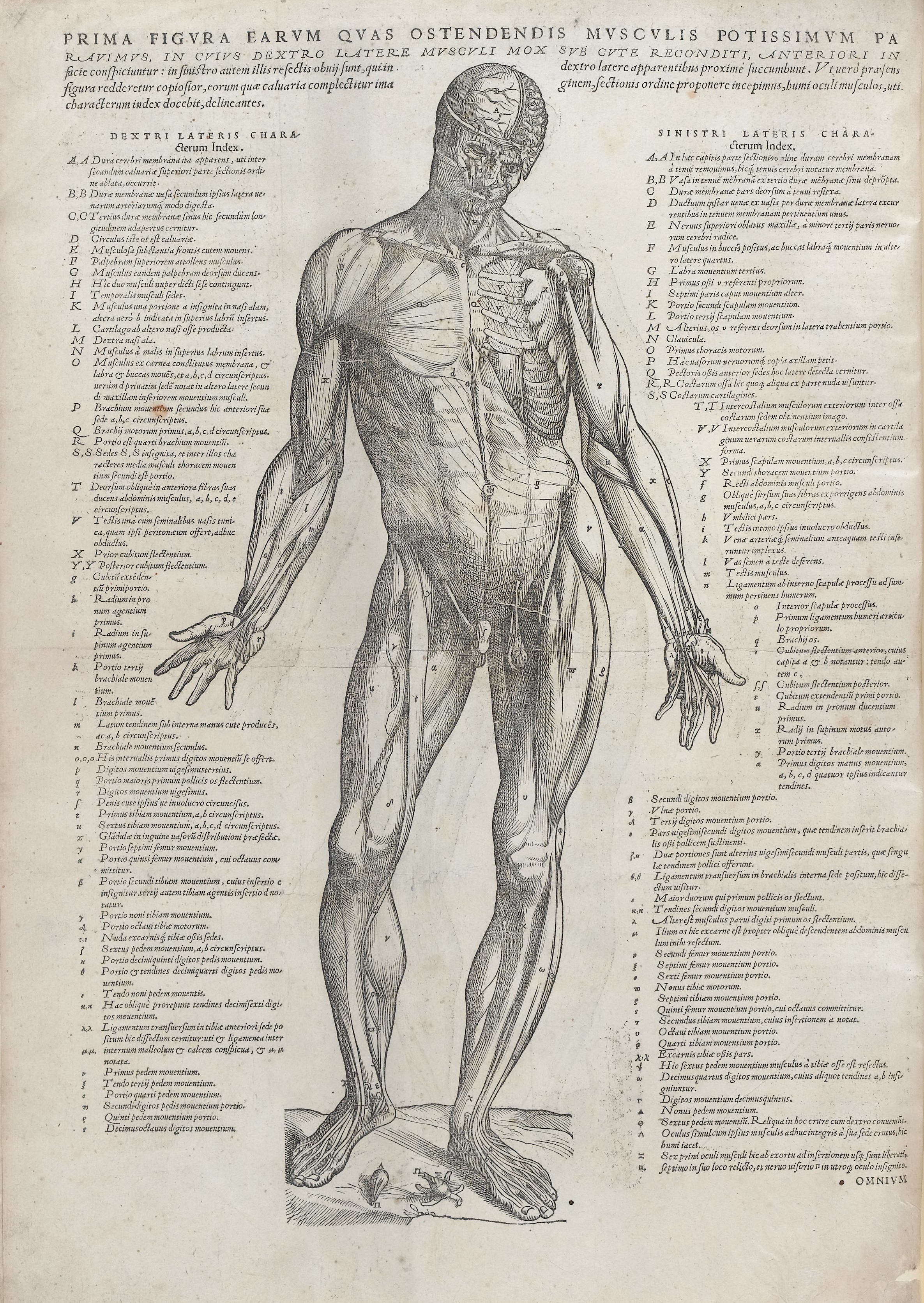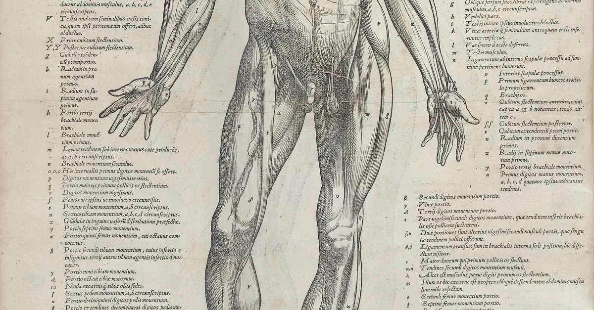 An intricately labelled diagram of the human muscles from Andreas Vesalius' (1514-1564) celebrated book on anatomy, On the Fabric of the Human Body, first published in 1543. (Wellcome Images)
