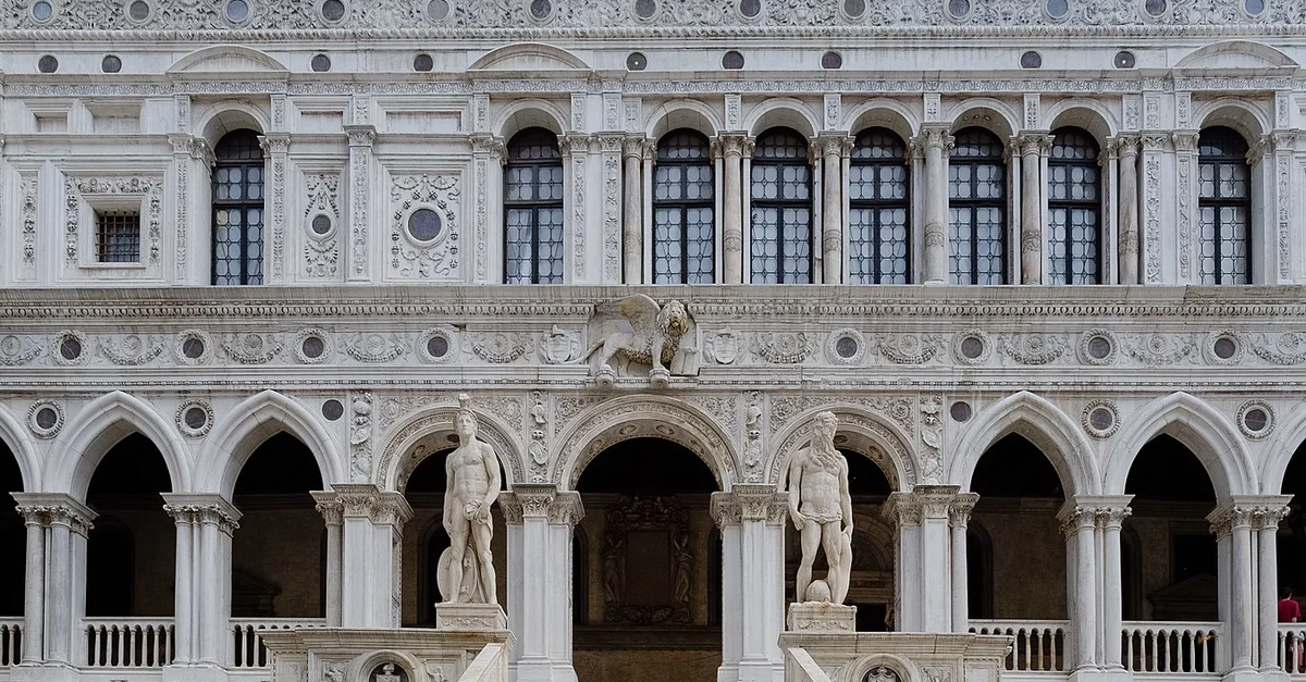 The Giants' Staircase, with statues of Mercury and Neptune on either side, in the courtyard of the Doge's palace, Venice, Italy.