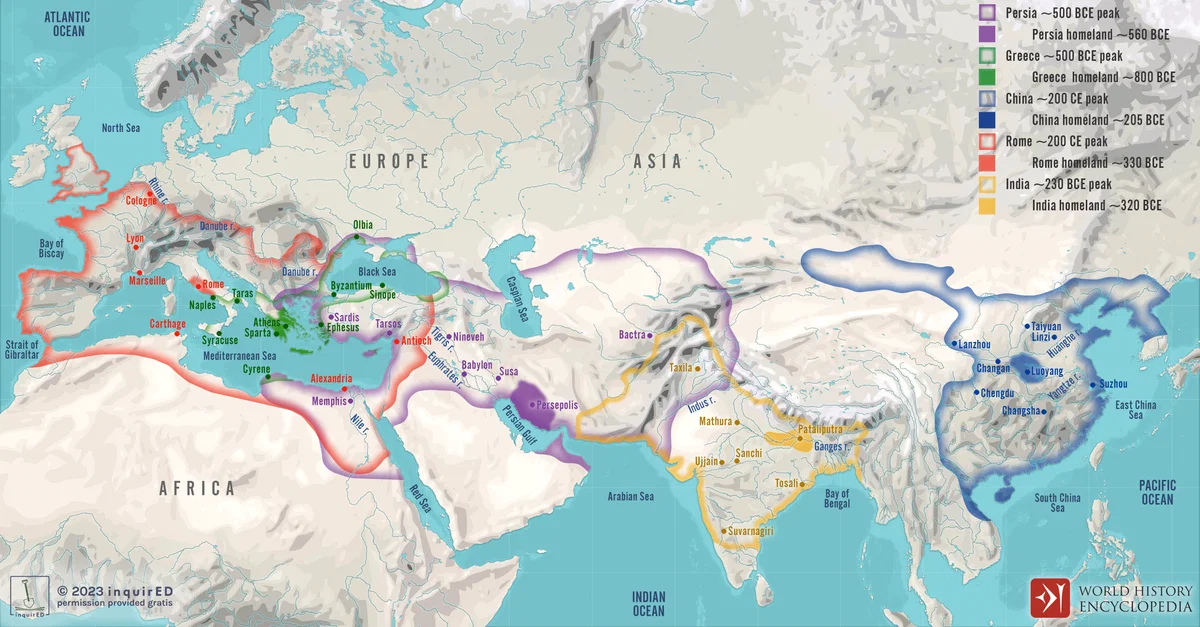A map illustrating the rise and spread of the Second-Wave Civilizations between c. 500 BCE and 200 CE, including the most notable urban settlements where civilizations flourished, transforming societies through trade, cultural exchange, and intellectual growth.
