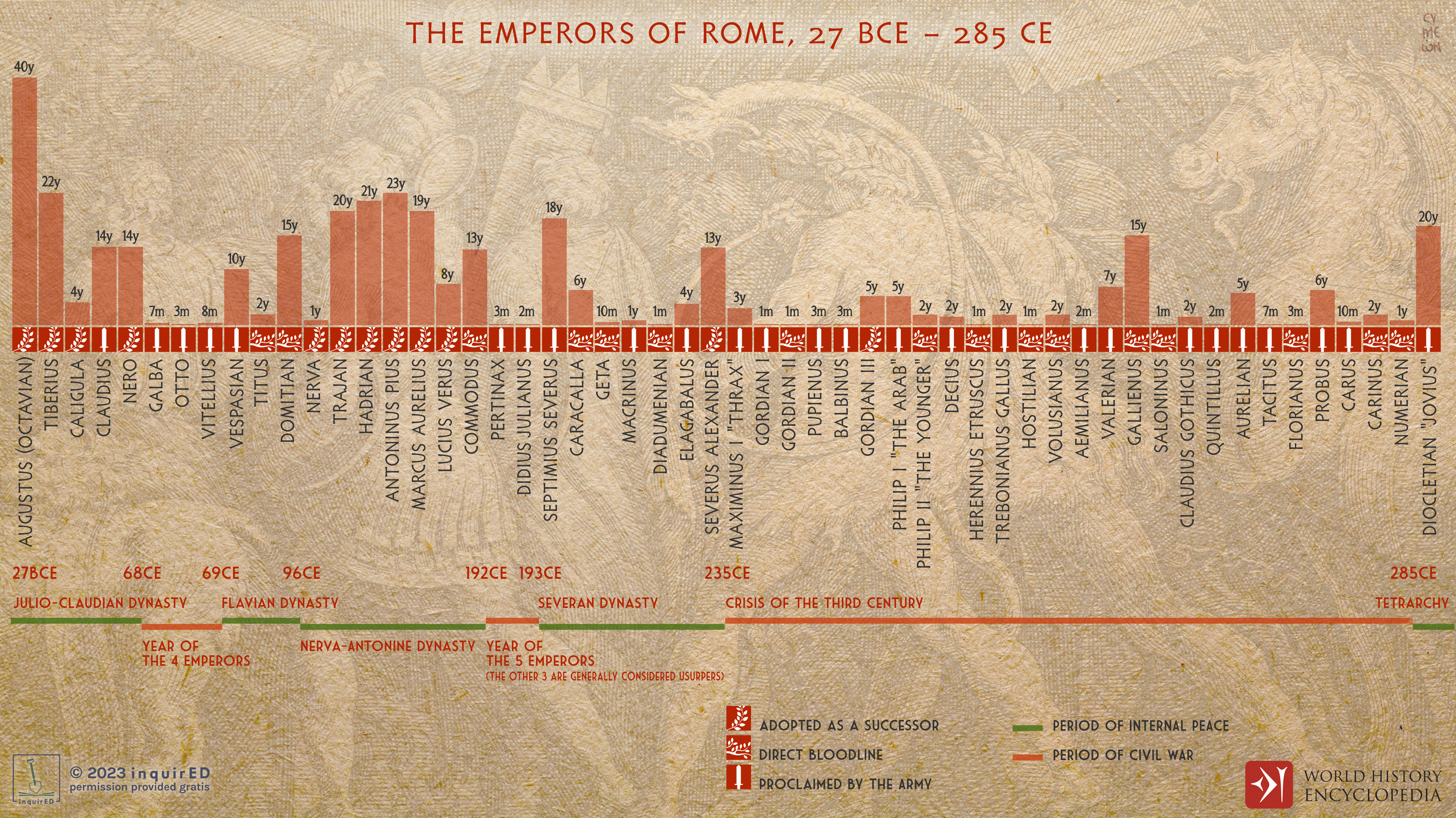 Netchev, S. (2023, September 04). The Emperors of Rome, 27 BCE - 285 CE. World History Encyclopedia. https://www.worldhistory.org/image/17855/the-emperors-of-rome-27-bce---285-ce/