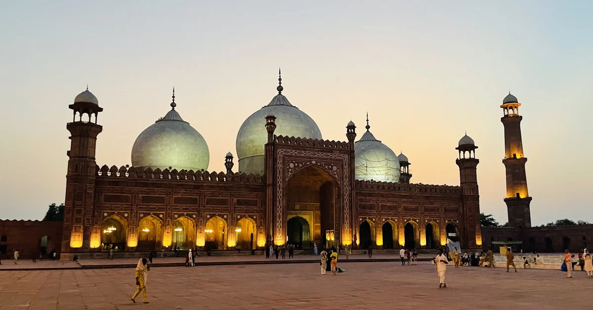 Badshahi mosque, built by the Mughal emperor Aurangzeb (r. 1658-1707 CE) in 1673-74 CE, in Lahore, Pakistan.