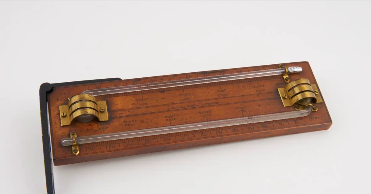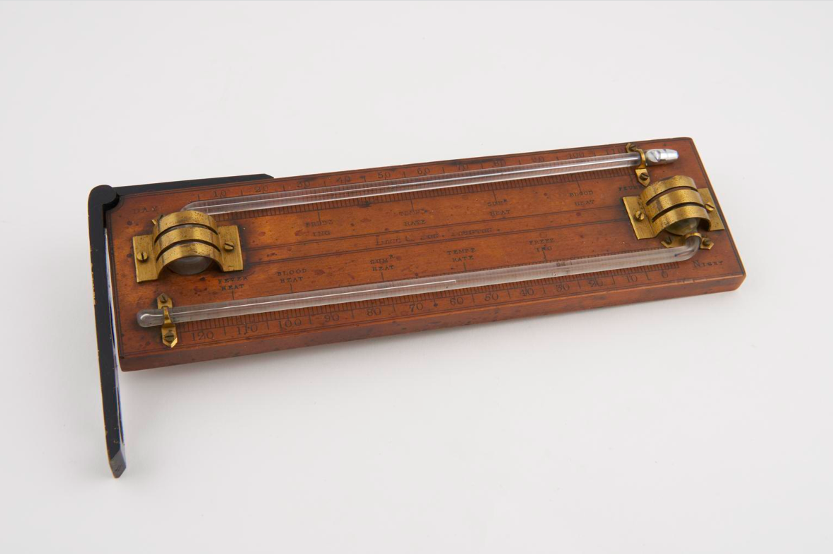 A Rutherford thermometer capable of taking minimum and maximum temperatures made in 1794 in England. (Science Museum, London)