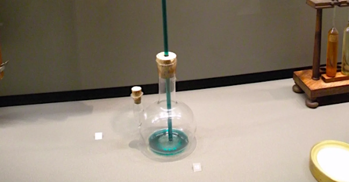 A thermoscope, an invention credited by some to Galileo (1564-1642). This type of early thermometer has a narrow tube filled with water which moves up a scale when air in the bulb is heated and so expands, pushing down the liquid. (Musée des Arts et Métiers, Paris)