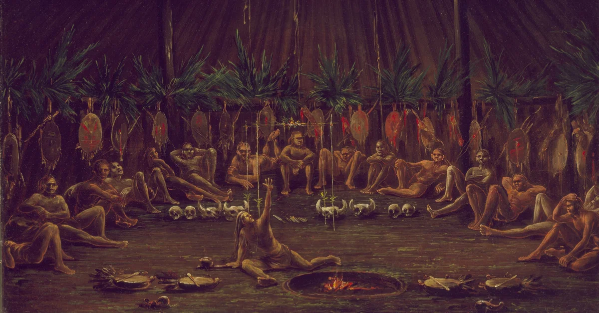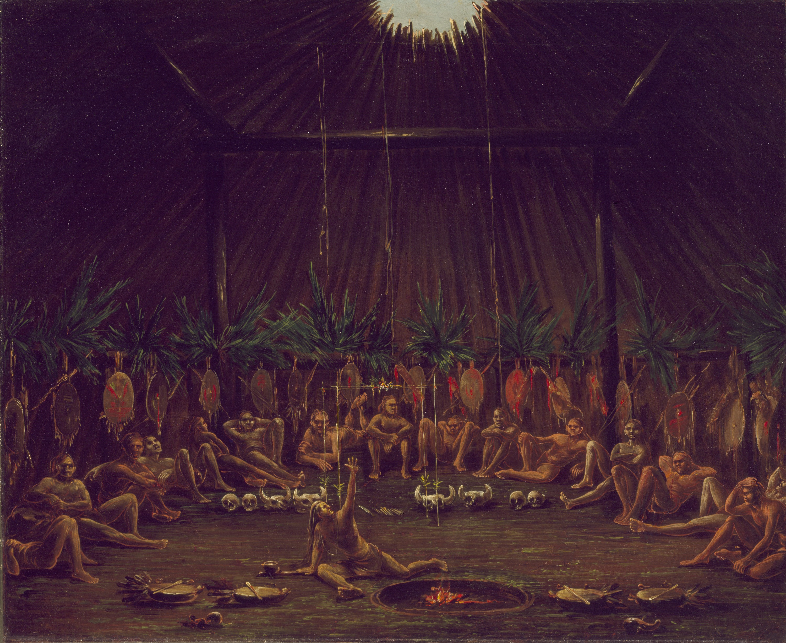 Interior View of the Medicine Lodge, Mandan O‑kee-pa Ceremony, oil on canvas by George Catlin, 1832.