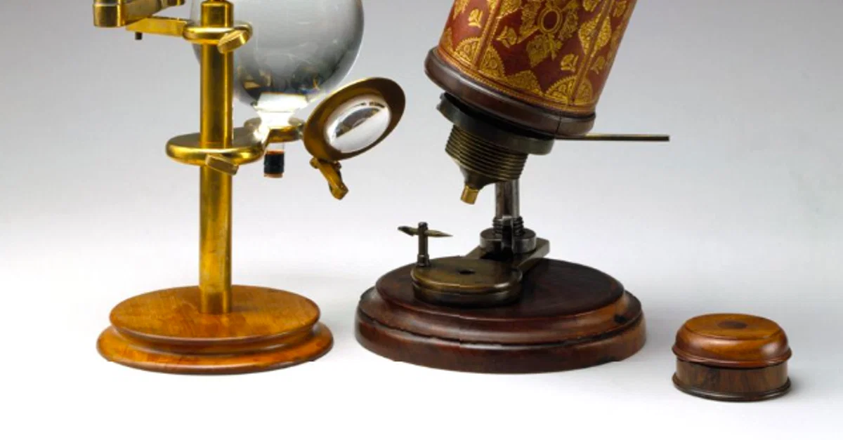 A microscope of the type invented by the English scientist Robert Hooke (1635-1703). Made between 1671 and 1700. The device on the left, designed by Hooke, is a scotoscope which helped better illuminate the specimen under view in the microscope. (Science Museum, London)
